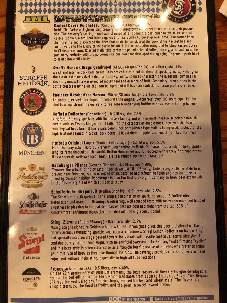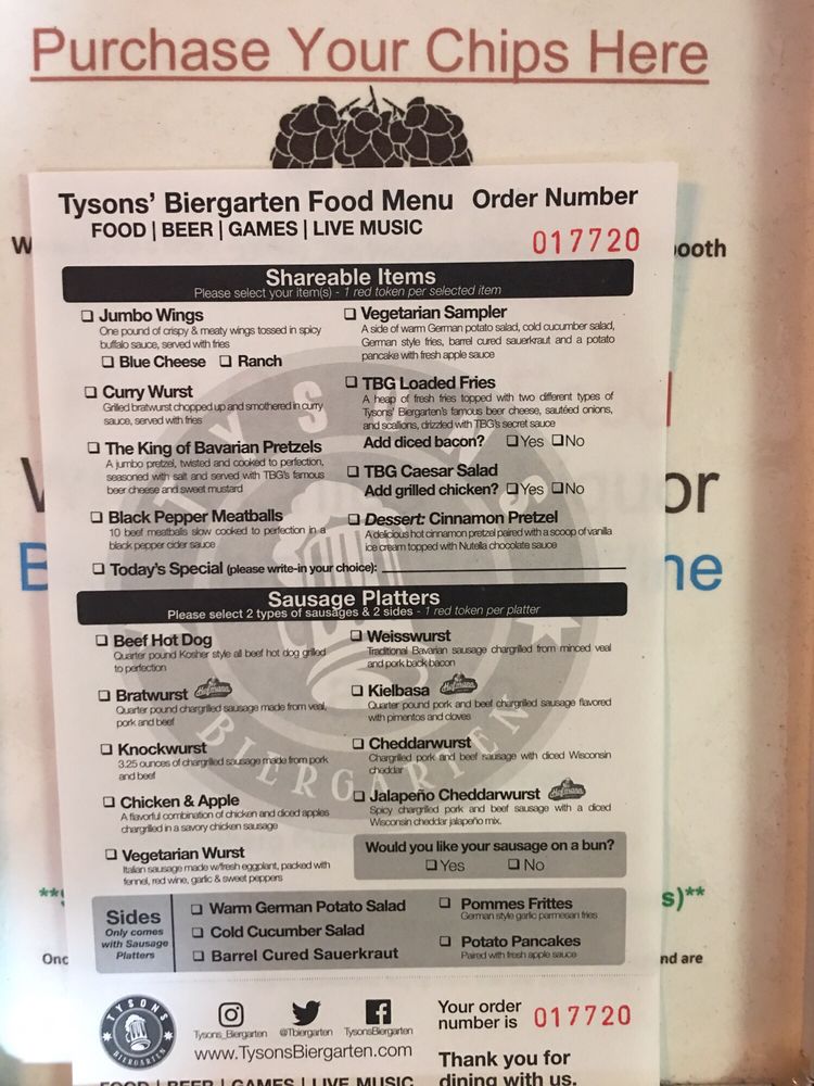 Located in McLean, VA, Tysons Biergarten offers a vibrant experience for beer enthusiasts and casual diners alike. With a diverse menu featuring German-inspired dishes such as Sausage Platters, Shareable Items, and delectable sides like Warm German Potato Salad and Barrel Cured Sauerkraut, the culinary offerings here are sure to please. The atmosphere is lively, with live music on select nights and a welcoming outdoor seating area for patrons to enjoy. While parking may be limited, the convenience of being near the Greensboro Metro Station makes it accessible. The unique token system for ordering adds a sense of novelty to the dining experience, allowing guests to sample a variety of drinks and dishes. Overall, Tysons Biergarten is a standout destination for those seeking a fun and flavorful outing.
